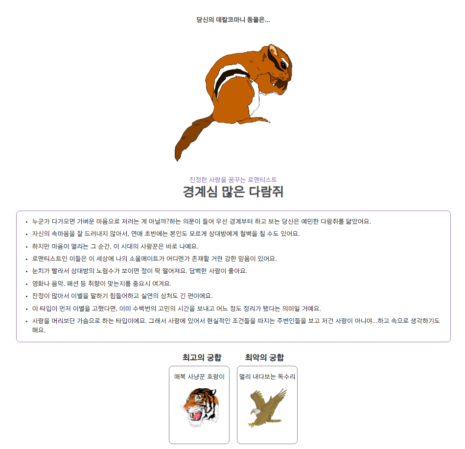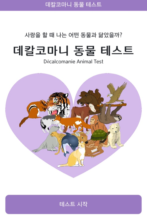 사랑을 할 때 나는 어떤 동물과 닮았을까? MBTI를 기반으로 나와 닮은 동물을 찾아주는 테스트입니다.