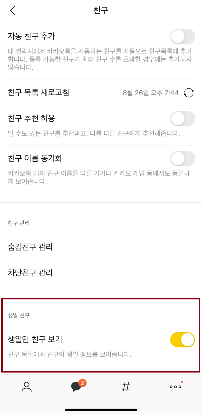 카카오톡 설정 - 친구 - 생일인 친구 보기 활성화