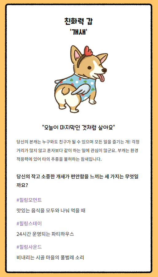 | 내가 강아지/고양이라면 어떤타입일까? 멍냥MBTI (0) | 2021.07.28 |