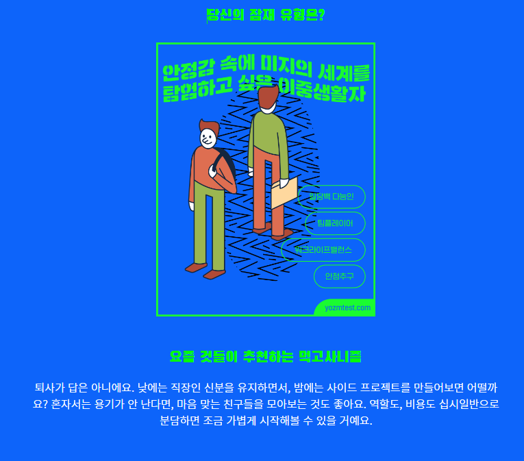 내안에 잠재된 먹고사니즘 유형을 알아보고 요즘것들이 선택한 일하기 방식을 추천 받아보세요.