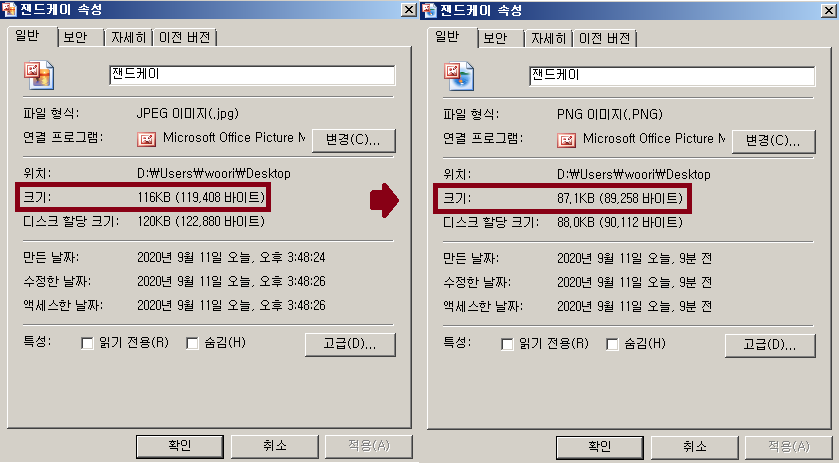 사진 용량이 작아진 파일을 확인하실 수 있어요.
