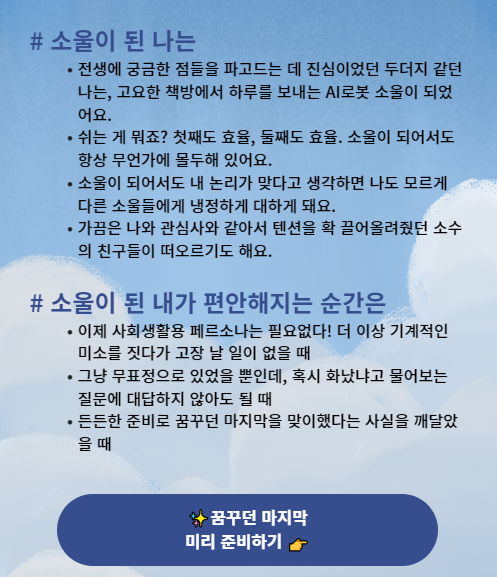 [소울이 된 나의 모습은?]소울이 된 나는, 어떤 모습으로 어디에 머물게 될까? 👀마음까지 몽글몽글 해지는 소울BTI 해보고나는 어떤 소울인지 MBTI와 함께 공유해줘 👻🤍