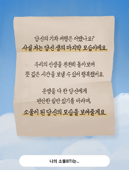 [소울이 된 나의 모습은?]소울이 된 나는, 어떤 모습으로 어디에 머물게 될까? 👀마음까지 몽글몽글 해지는 소울BTI 해보고나는 어떤 소울인지 MBTI와 함께 공유해줘 👻🤍