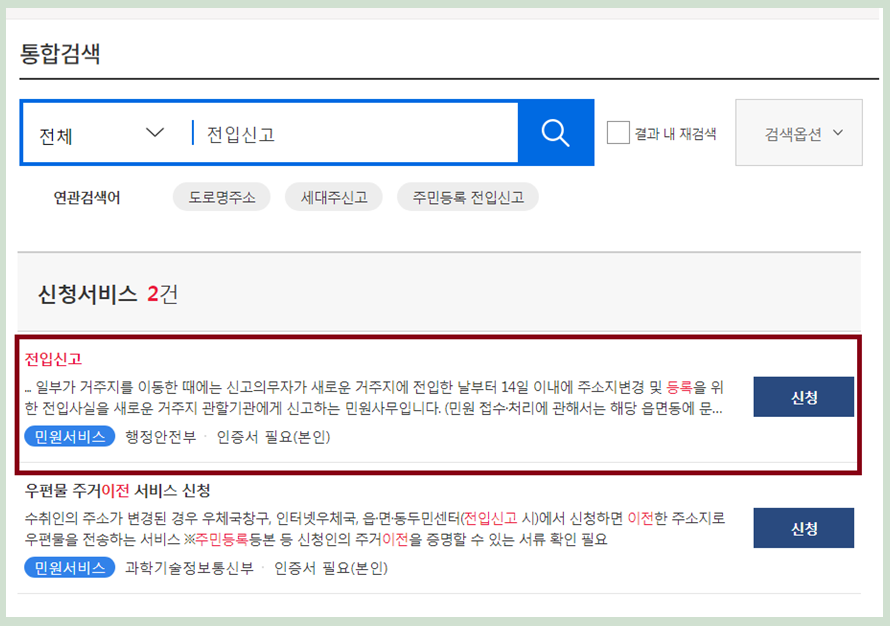 1. 민원24시 홈페이지 접속후 중앙 검색창에 전입신고를 검색해주세요.
