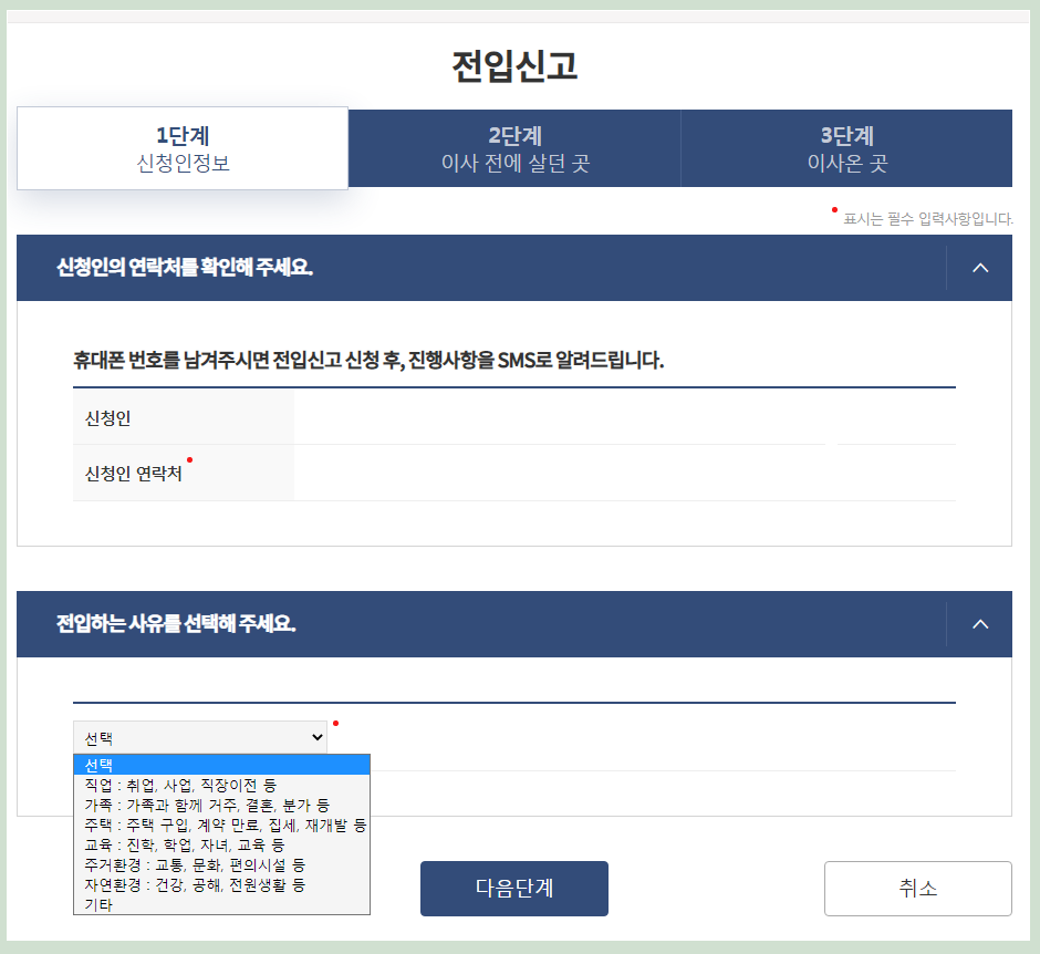 <1단계 신청인 정보 - 2단계 이사 전에 살던 곳 - 3단계 이사 온 곳>