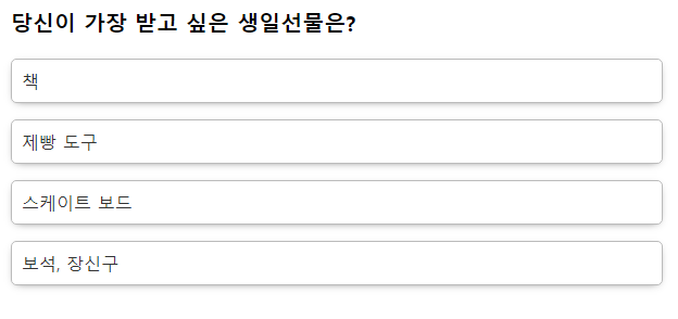이곳 역시 성향을 파악할 수 있는 단순하고 간단한 질문들이 나와요.