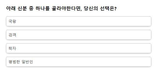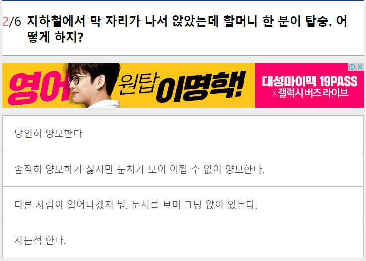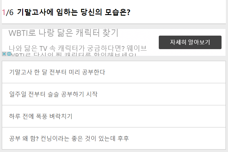 이곳 역시 성향을 파악할 수 있는 단순하고 간단한 질문들이 나와요.