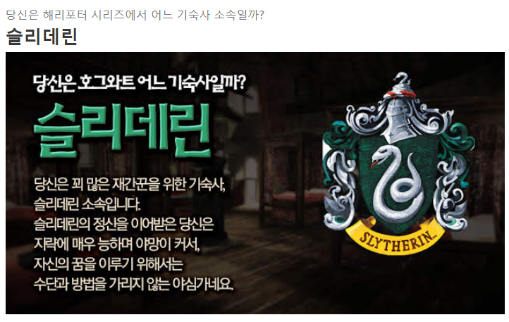 저는 두가지 테스트 모두 슬리데린 기숙사가 나왔습니다.