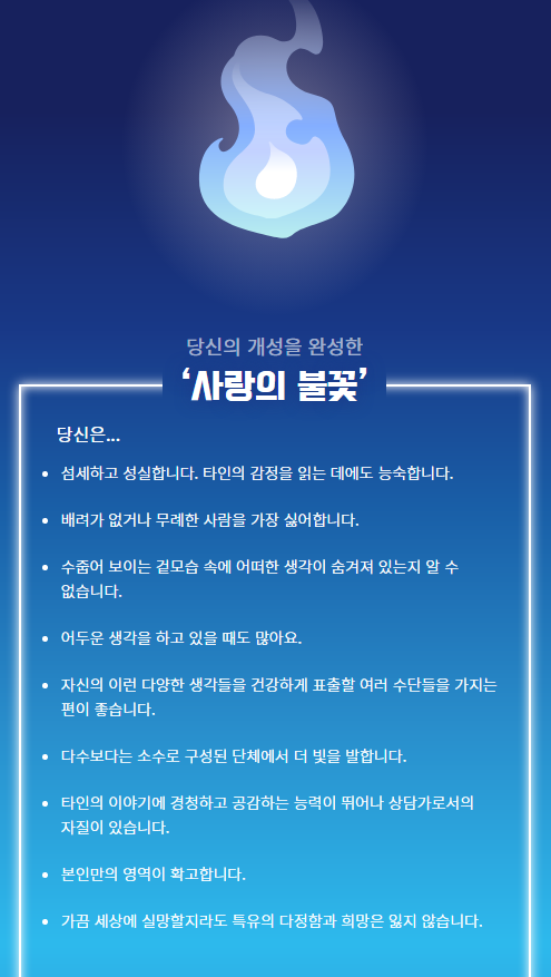 결과 아래에는 본인의 성격 관련 설명이 제시되어있어요.
