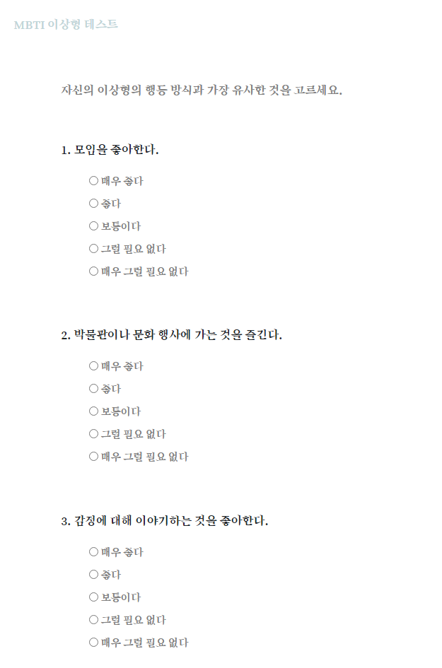 MBTI 성격유형 테스트랑 비슷한 구조로 이루어져 있어요